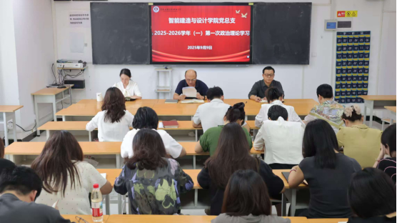 2025年9月9日下午,智能建造与设计学院于F110召开2025-2026学年第一学期第一次政治理论学习。院长李勇、党总支副书记刘亚娟及全体教职工党员参加学习,会议由党总支书记张虎主持。