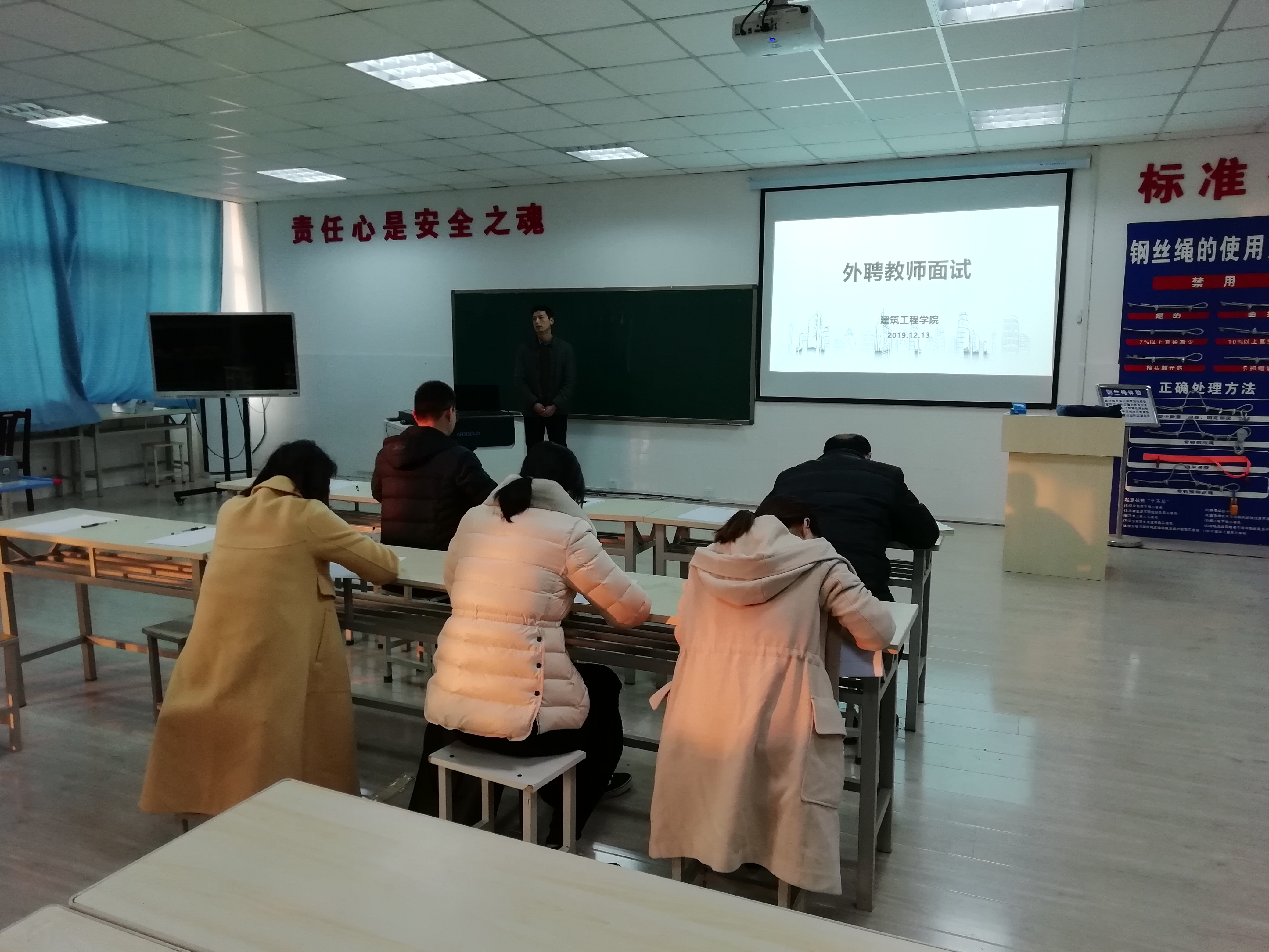 按照学校的工作要求,304am永利集团如期安排2019-2020学年第二学期外聘教师试讲工作。2019年12月11日和13日,在E310建筑装配式实训室,学院办公室分两批对李刚、刘慧和刘越等8位外聘老师进行了试讲,院长张虎和人事处、教务处和教学发展质量管理处等部门有关人员出席。大家分别对试讲人员的师德师风、仪表仪态、专业水平、课堂把控能力和基本教学流程等内容进行了考核。