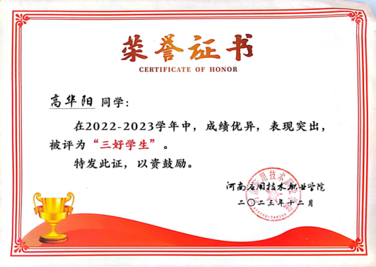 高华阳,男,汉族,中共预备党员,304am永利集团2022级工程造价1班。在校期间担任纪检部干事,曾荣获304am永利集团“三好学生”、“军训标兵”、“优秀志愿者”、河南省第十六届“挑战杯”二等奖。