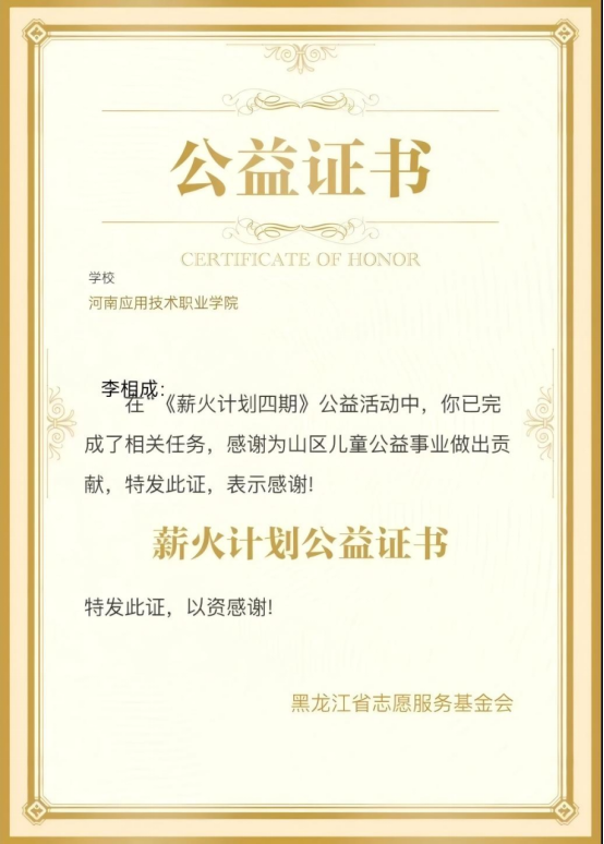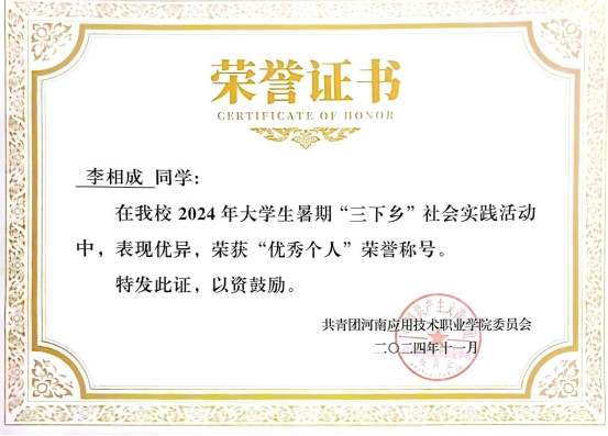 李相成深知,对于留守儿童而言,精神上的关爱与陪伴比物质上的帮助更为重要。因此,他认真倾听他们的心声,分享自己的成长故事,给予他们温暖的鼓励和积极的引导。他积极组织孩子们参与各种活动,在游戏中培养他们的协作能力和自信心。他的真诚付出与团队的共同努力,赢得了当地政府和群众的高度赞扬,他本人也荣获“三下乡优秀个人”称号。这次特殊的经历,让他深刻体会到奉献带来的快乐与满足,也更加坚定他未来服务社会、回报社会的决心与信念。