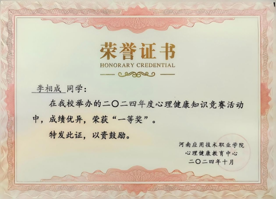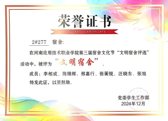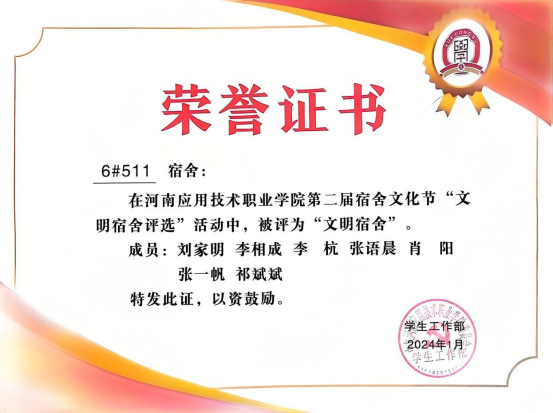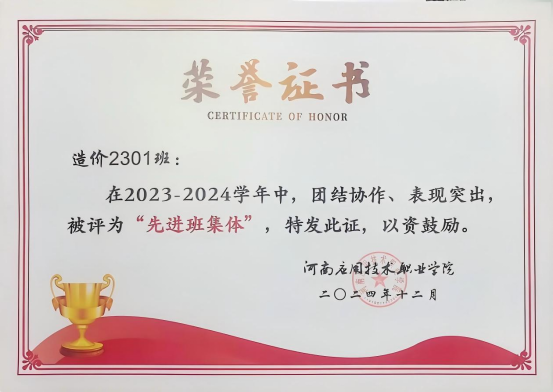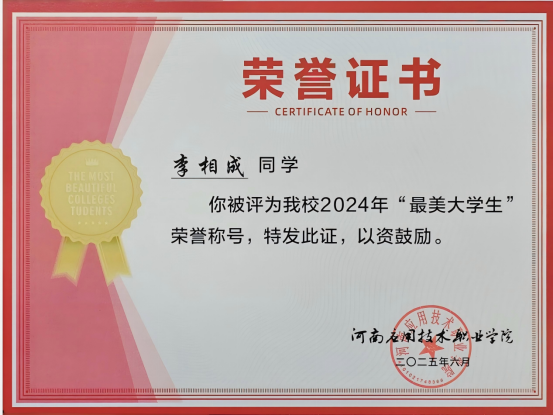 在担任班长期间,李相成展现了他细致入微、体贴关怀的一面。他始终将同学们的冷暖放在心上:有同学生病,他主动帮忙整理笔记、送饭送药;有同学因学业压力情绪低落,他耐心开导,分享经验;天气变化,他及时提醒大家增减衣物;同学间出现矛盾,他第一时间介入调解,化解隔阂。这些看似平凡的小事,却如春雨般滋润着班集体。他温暖的举动,让班级充满家的温度,也成了同学们最信赖的贴心人。在他的带领下,造价2301班于2024年12月荣获校级“先进班集体”称号,2025年荣获省级“先进班集体”称号。