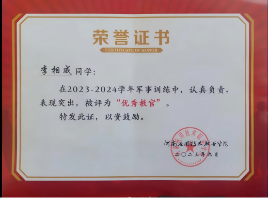作为一名退伍军人,李相成积极响应学校号召,参与新生军训工作,并担任教导大队队长。这一角色是责任的延续,也是军人本色的传承。他将部队的优良作风和严格标准融入军训的每一个环节:从队列训练到内务整理,从纪律要求到思想教育,他都亲力亲为,一丝不苟。他不仅传授军事技能,更用亲身经历向新生们阐释军人精神的内涵,引导他们树立正确价值观,培养他们的纪律意识和吃苦耐劳的精神。因其出色的表现,他在2023—2024年被评为“优秀教官”。