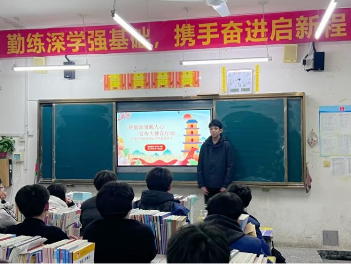 2026年1月30日,我回到母校博爱职业中等专业学校,开展国家资助政策宣传活动。我向学弟学妹们详细讲解了国家奖助学金、国家励志奖学金、国家助学贷款及勤工助学等资助项目,结合自身求学期间申请助学金的经历,重点介绍了各项资助的申请条件、评审流程和资助标准,让大家清晰了解到从入学前的助学贷款,到在校期间的奖助勤补,再到毕业后的基层就业学费补偿等全方位的资助体系。我通过PPT演示和现场答疑,帮助学弟学妹们消除了对资助政策的信息差,鼓励贫困学生不要因为家庭贫困而放弃求学,让国家的好政策真正惠及每一位有需要的学子。