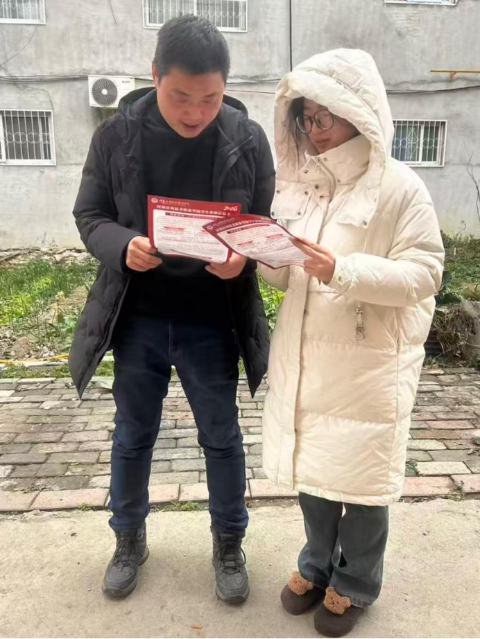 2026年2月12日,为切实做好家庭经济困难学生资助工作,让惠民政策落地见效,我在小区公示栏张贴资助标准、申请条件及办理流程;同时上门走访家中有在校大学生的住户,一对一讲解国家助学金、助学贷款、励志奖学金等政策,解答申报疑问,确保符合条件的家庭不漏知、不错过,助力每一位学子安心求学。